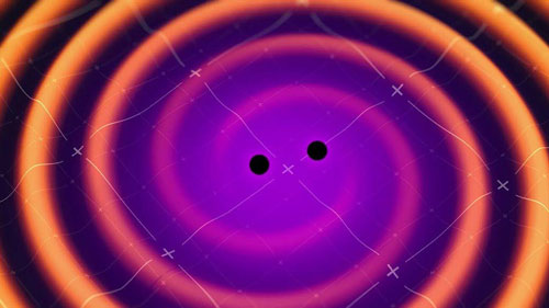 Two black holes orbit around each other and generate space-time ripples called gravitational waves in this image.