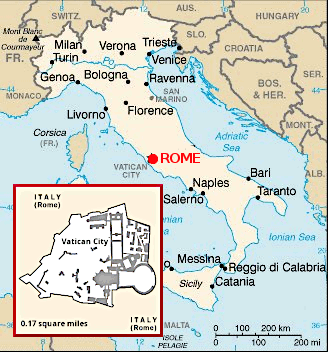 Q: After the death and funeral of Pope Francis last week, 135 cardinals were preparing to meet in Vatican City to elect the next leader of the Roman Catholic Church. The state of Vatican City is in Rome. Where is Rome on this map of Italy?