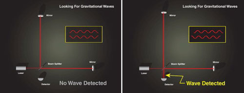 Still images of how LIGO (Laser Interferometer Gravitational-Wave Observatory) detects gravitational waves using a laser, mirrors, and a detector. You can find the animated version here.